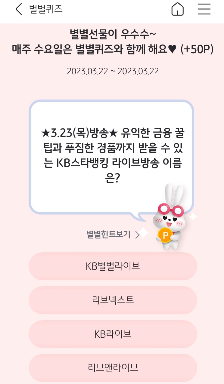 별별퀴즈는 KB스타뱅킹 어플에서 매주 수요일날 참석하실 수 있습니다.